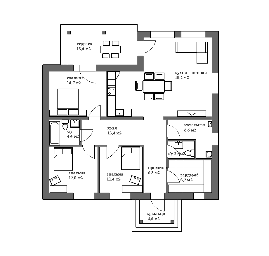 Одноэтажный дом площадью 120,6 м2 + крыльцо 4,6м2 + терраса 13,4м2