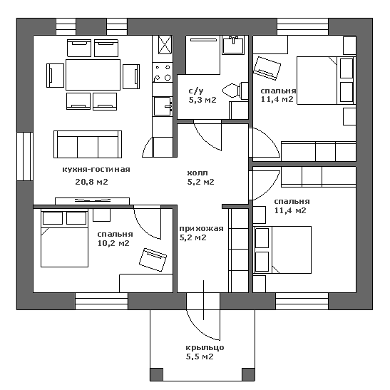 Одноэтажный дом площадью 70 м2 + крыльцо 5,5м2